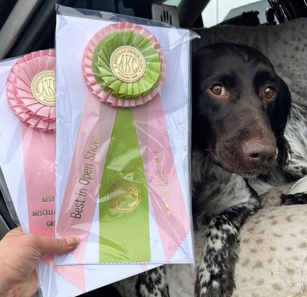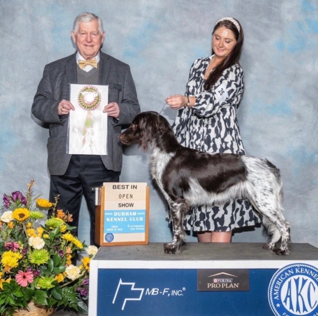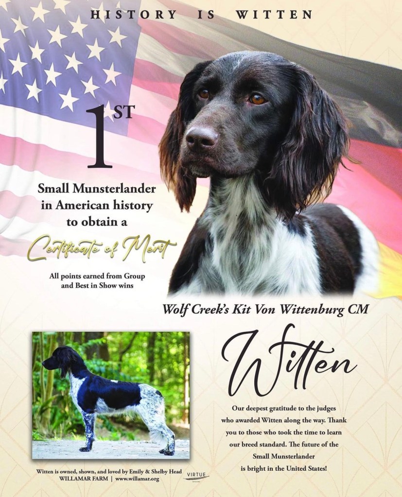 Witten MAKES HISTORY on March 10th, 2023 in Raleigh as the first Small Munsterlander in the United States to finish a Certificate of Merit. Thank you to all the judges who have awarded her along the way!