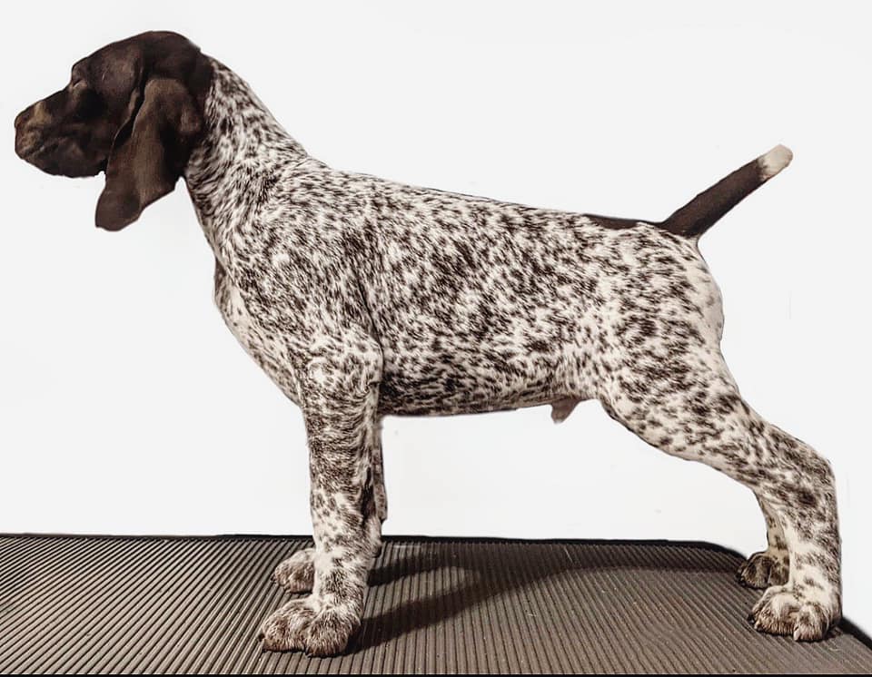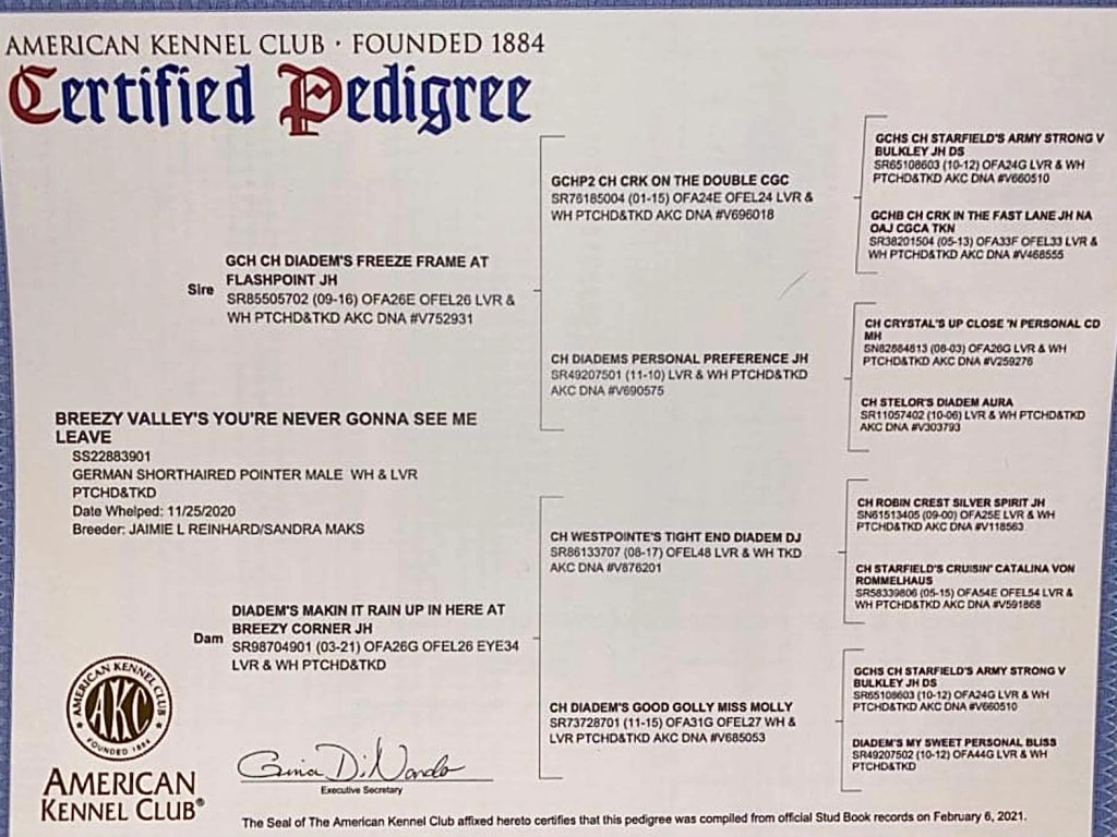 Walker is sired by GCH Diadem’s Freeze Frame at Flashpoint JH, “Tucker.” Tucker did very well at the 2016 NSS winning BOS in Puppy Sweepstakes and placing in his Futurity class. After Nationals Tucker returned to So Cal and enjoyed some training in the field, earning his JH title in 4 straight braces. Tucker has a stylish, intense point and is very birdy. Tucker was shown as a special periodically on the West Coast by Shane Hooper, garnering a number of breed wins and a Group 4 at the Arizona Sporting Dog Fanciers show. Tucker exudes breed type with effortless movement, a rock solid topline, beautiful head piece, forechest and rear angle. Tucker has a sweet temperament which completes the package of a beautiful dog inside and out. Walker’s dam, Diadem’s Making It Rain Up In Here at Breezy Corner JH, “Khloe” is a very happy, good spirited dog with a strong prey drive. She is a powerhouse hunter, yet in the home, a very calm and sweet girl who just loves to cuddle and spend time with our family. She earned her AKC Junior Hunter title in the fall of 2018. She has participated in advanced Scent Work and tracking training. Khloe has a stunning head piece, smooth top line and great angles. She has a very intense, stylish point. She is owned by Jaimie Reinhard and co-owned and bred-by Sandy Maks.
