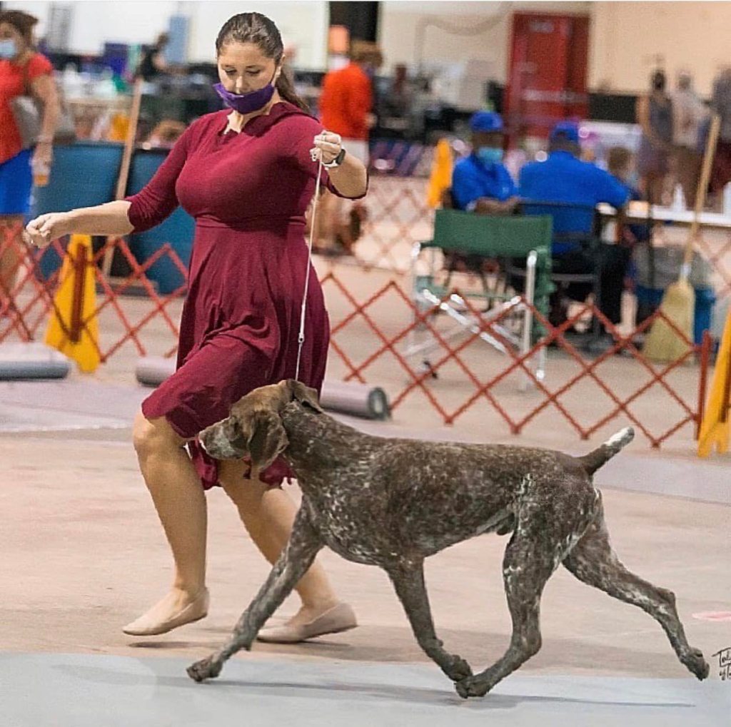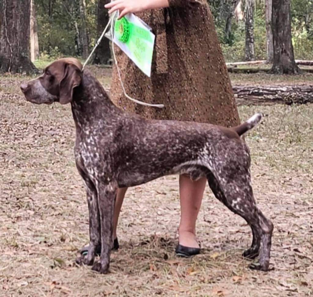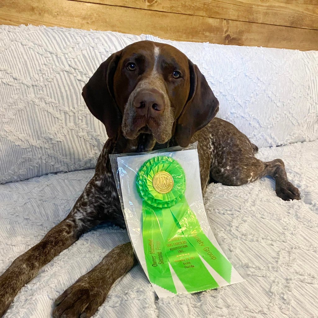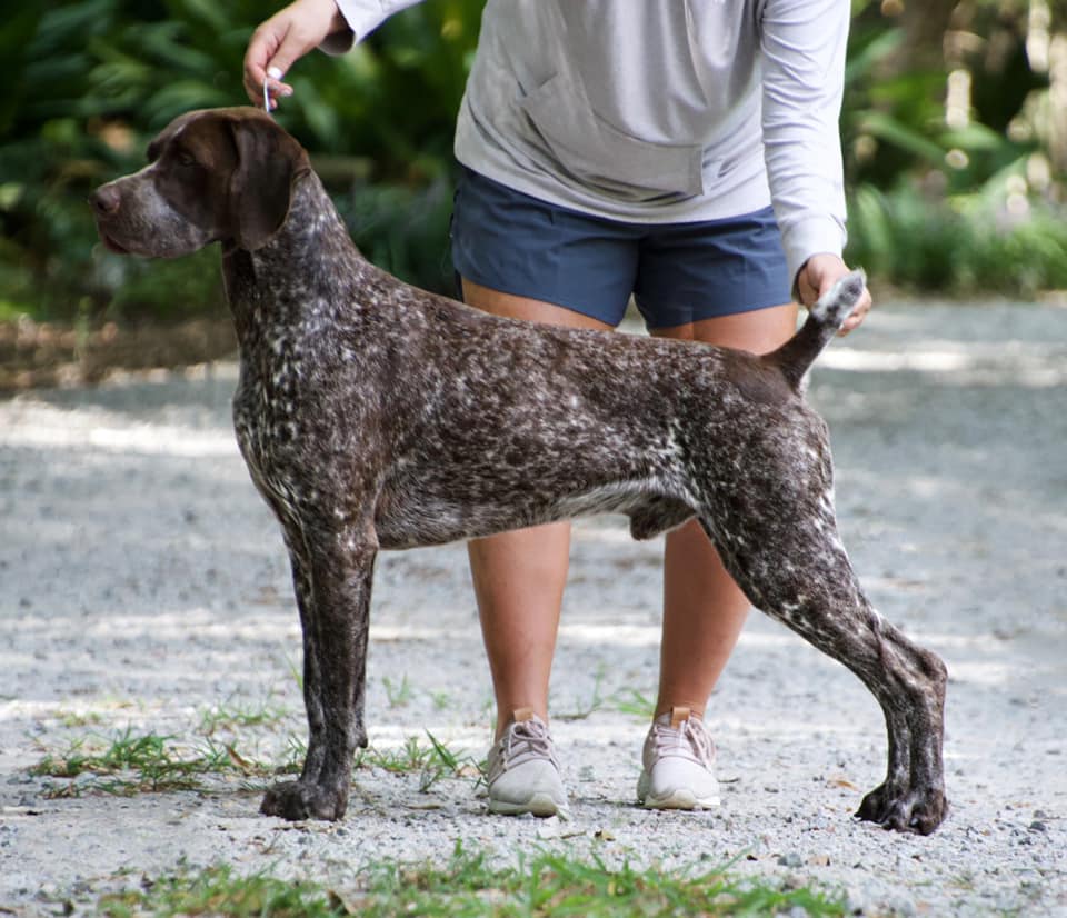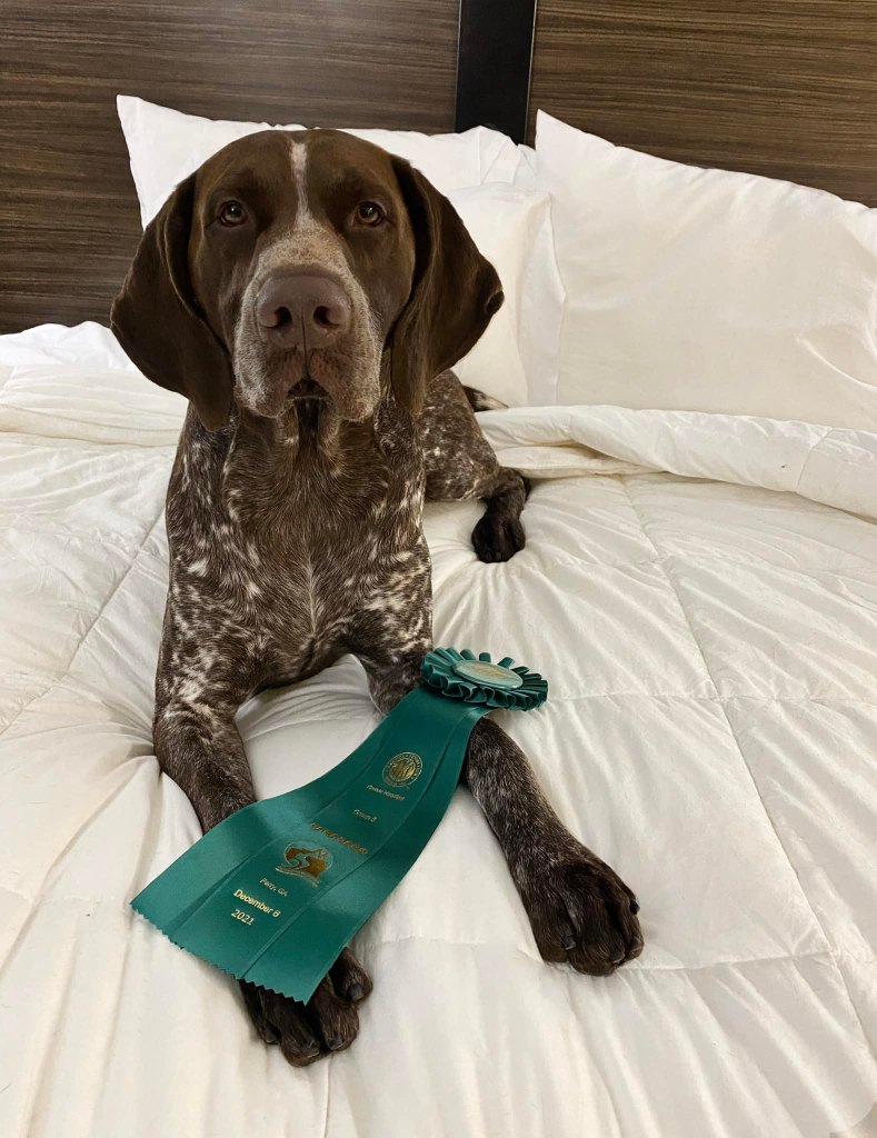I describe Ward as an “old soul.” He is very quiet, calm, and loving in the house. Although an independent dog, he is very loyal and attentive to his person – Emily. Like all GSPs, Ward turns on the engines once he gets outside. He has fantastic energy and stamina in the field and a brain that does not quit. He handles in the field with ease. Ward completed three months of professional gun dog training with Kirk McConnor in the fall of 2020. He completed his Junior Hunter title in November of 2020 with four straight passes and high scores. The following week he aced his NAVHDA Natural Ability Test with perfect scores across the board for a Prize 1, 112. Ward is currently training for the Senior Hunter, which we hope to complete in the winter of 2021/22. Ward has a serious love for the water, so once his Senior is completed, we plan to train for the Utility test. In the show ring Ward has been owner handled from the start (with the exception of Clemson Kennel Club, 2021 when Emily had a broken left hand) and is a blast to handle in the ring. He shows calmly and confidently. Ward received his first big win in October of 2020 at the Atlanta Kennel Club under breeder judge Mr. Steve Herman. A few short months later he was Winner’s Dog during the 2020 AKC National Championship week under Mr. Jason Hoke. Ward is a very special boy with unlimited potential and we can not wait to see where he’ll take us. Ward finished his AKC Championship in April of 2021, going Best of Opposite over specials at the Asheville Kennel Club under esteemed judge, Mrs. Meghen Riese-Bassel. Ward will be shown selectively while he continues his gun dog training over the next year.