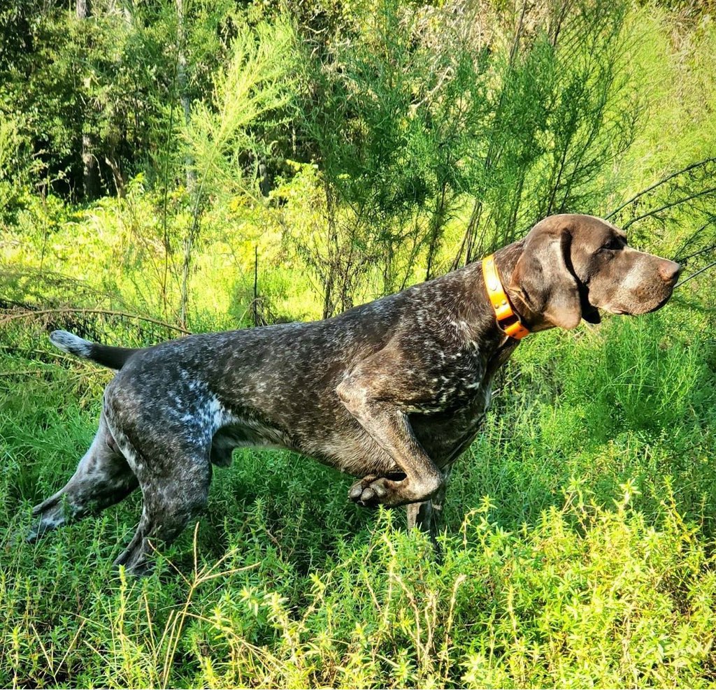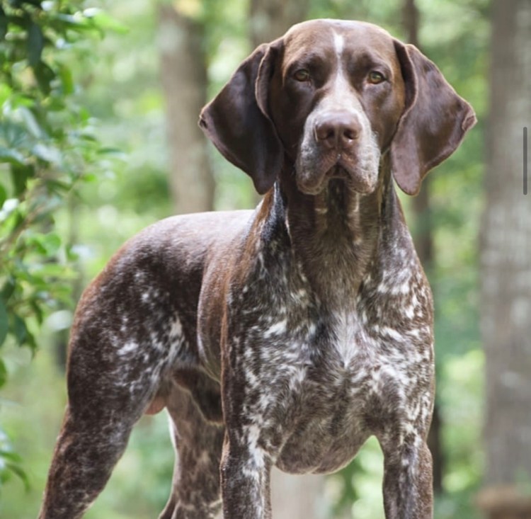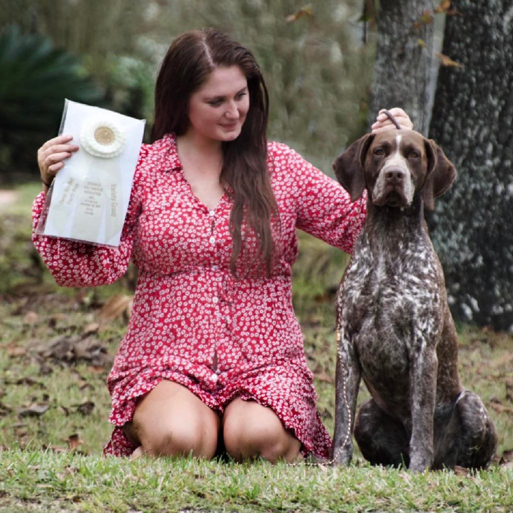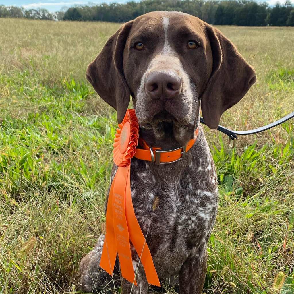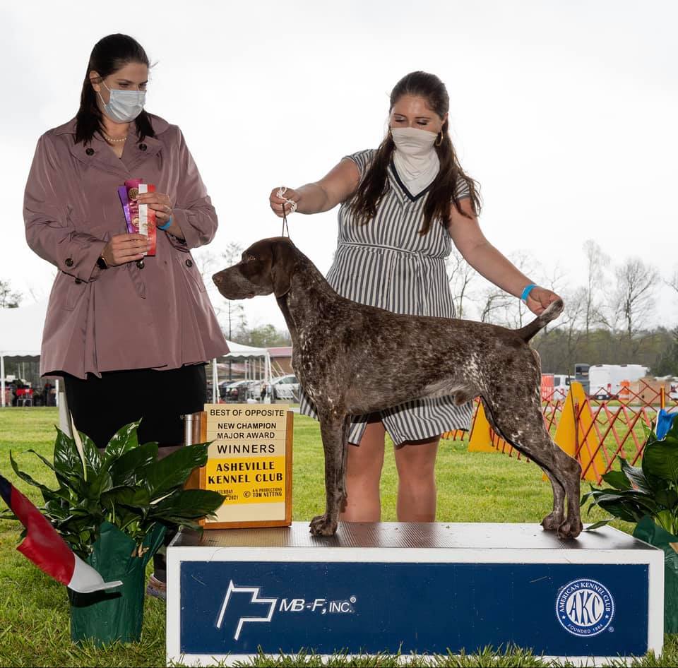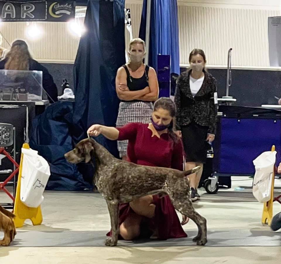 I describe Ward as an “old soul.” He is very quiet, calm, and loving in the house. Although an independent dog, he is very loyal and attentive to his person – Emily. Like all GSPs, Ward turns on the engines once he gets outside. He has fantastic energy and stamina in the field and a brain that does not quit. He handles in the field with ease. Ward completed three months of professional gun dog training with Kirk McConnor in the fall of 2020. He completed his Junior Hunter title in November of 2020 with four straight passes and high scores. The following week he aced his NAVHDA Natural Ability Test with perfect scores across the board for a Prize 1, 112. Ward is currently training for the Senior Hunter, which we hope to complete in the winter of 2021/22. Ward has a serious love for the water, so once his Senior is completed, we plan to train for the Utility test. In the show ring Ward has been owner handled from the start (with the exception of Clemson Kennel Club, 2021 when Emily had a broken left hand) and is a blast to handle in the ring. He shows calmly and confidently. Ward received his first big win in October of 2020 at the Atlanta Kennel Club under breeder judge Mr. Steve Herman. A few short months later he was Winner’s Dog during the 2020 AKC National Championship week under Mr. Jason Hoke. Ward is a very special boy with unlimited potential and we can not wait to see where he’ll take us. Ward finished his AKC Championship in April of 2021, going Best of Opposite over specials at the Asheville Kennel Club under esteemed judge, Mrs. Meghen Riese-Bassel. Ward will be shown selectively while he continues his gun dog training over the next year.