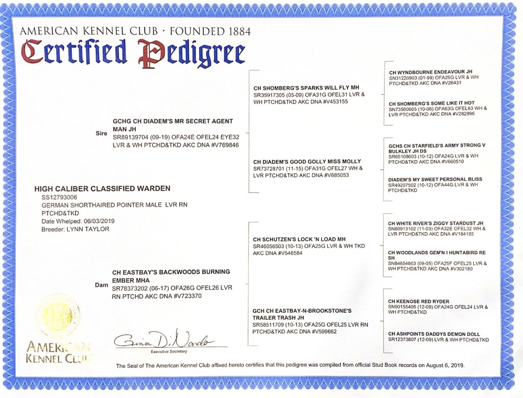Ward is sired by the famous “Magnum,” BISS GCHP Diadem’s Mr. Secret Agent Man JH NA112 – #1 GSP Dog in 2019. Magnum has many memorable wins, but most noted are BOS at Westminster 2020, BOS 2019 AKC National Championship, and several Group Wins along the way. Magnum has two legs towards his Senior Hunter title, which he will finish in 2021. Ward’s dam “Ember” is equally as impressive. GCH Eastbay’s Backwoods Burning Ember MHA UT1. Ember earned her Master Hunter title at the young age of 15 months, and went on to become the youngest German Shorthaired Pointer in history to obtain a Master Hunter Advanced (6 passes) which she did at 26 months old. Ember finished her Grand Championship in January of 2020. Both Magnum and Ember embody the ideal temperament, which they passed down to their son.
