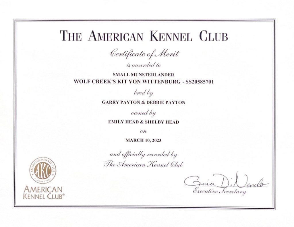 As of March, 10th 2023, Witten is the first Small Munsterlander in UNITED STATES HISTORY to finish a Certificate of Merit. Thank you to all the judges who have awarded her along the way and helped make history.